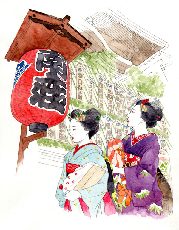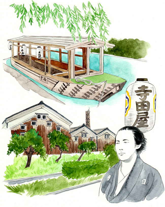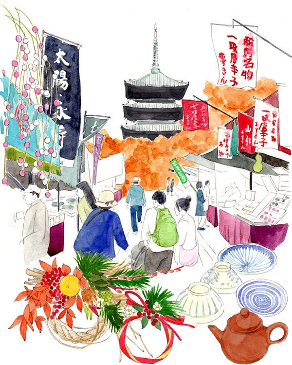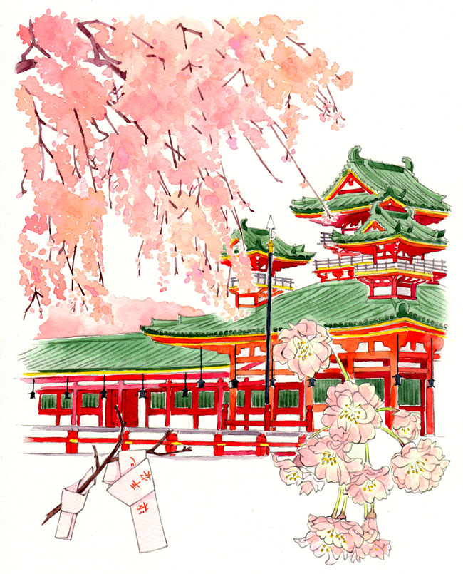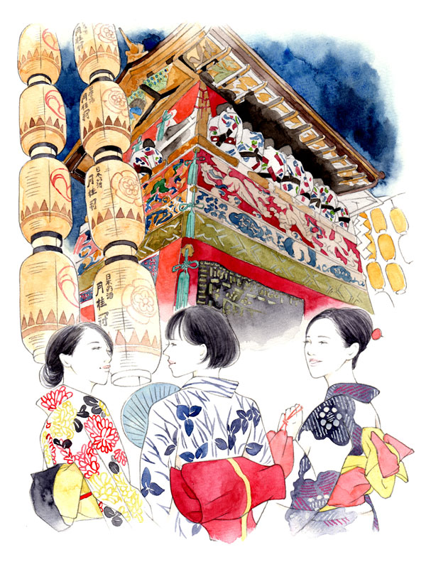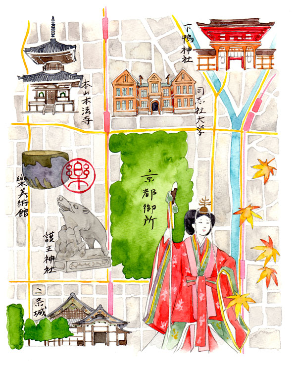 月桂冠が東京メトロ全線、東急線全線、京王線全線、小田急線全線、東武線全線、西武線全線にて展開するドアステッカー広告でイラストを描いています。 テーマは「京都からの絵手紙」。