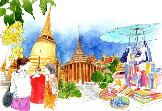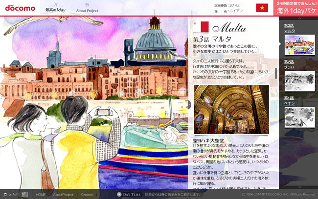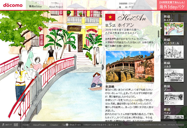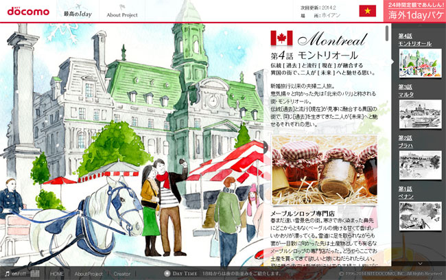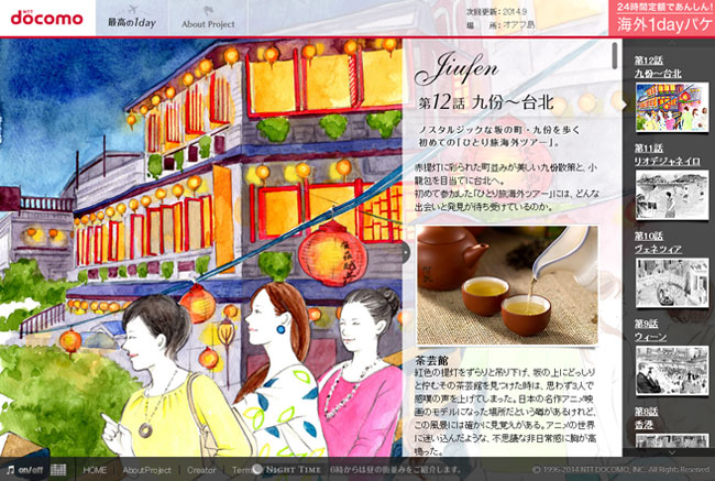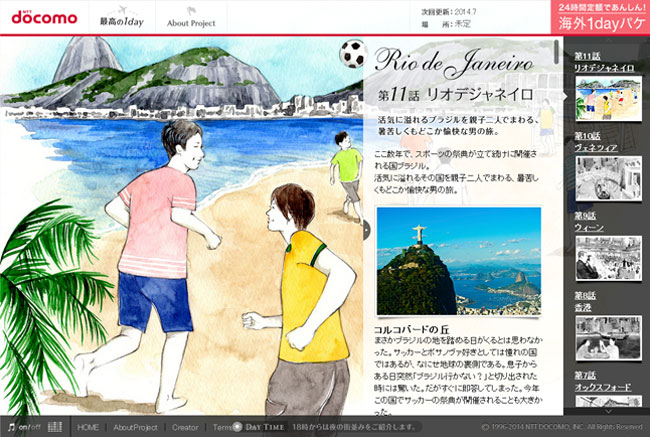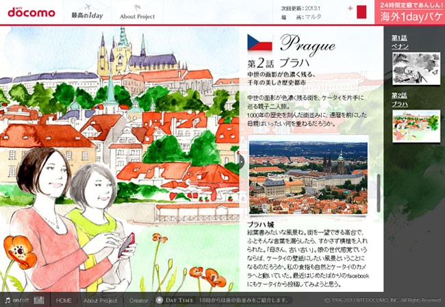 docomoの国際ローミングサービス「海外1dayパケ」を紹介するWebマガジン「最高の1day」で2013年12月から連載スタートしました。海外渡航を考えているdocomoユーザー向けのサービスで、渡航に役立つ情報や海外の風土や習慣の案内など、Webマガジン的な内容になってます。1話に1つ都市を紹介するのですが、私はメインイラストを毎回担当します。