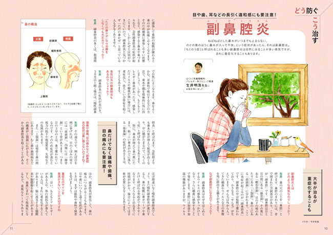 保健同人社から発行の会員誌「笑顔」で4月から「どう防ぐこう治す」のコーナーの挿絵を