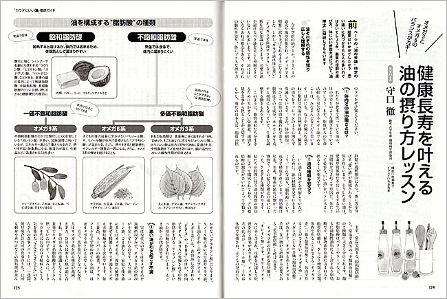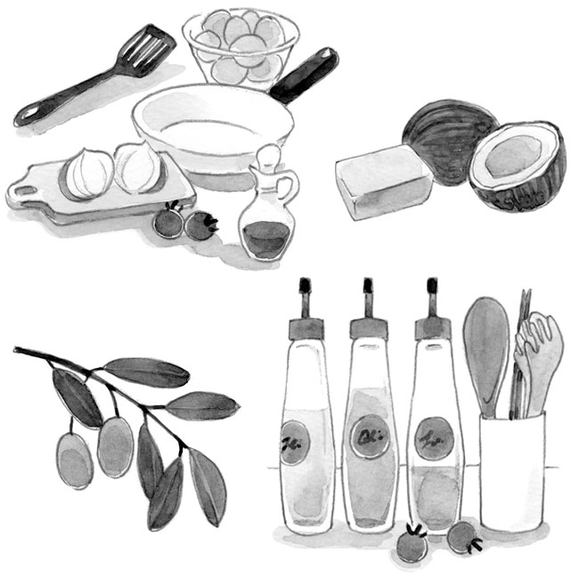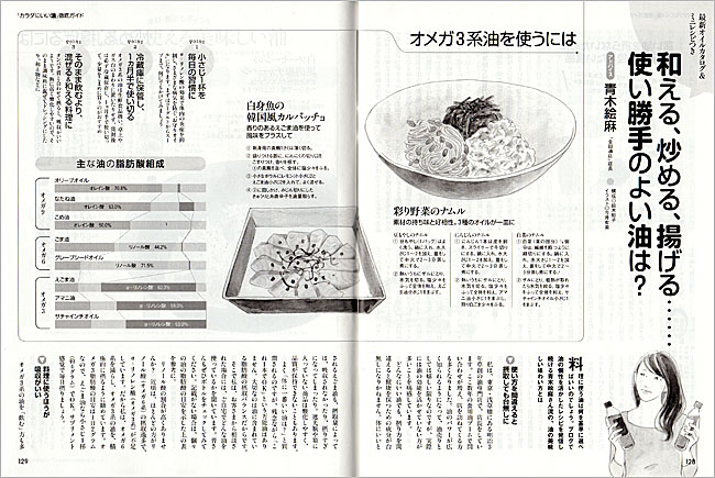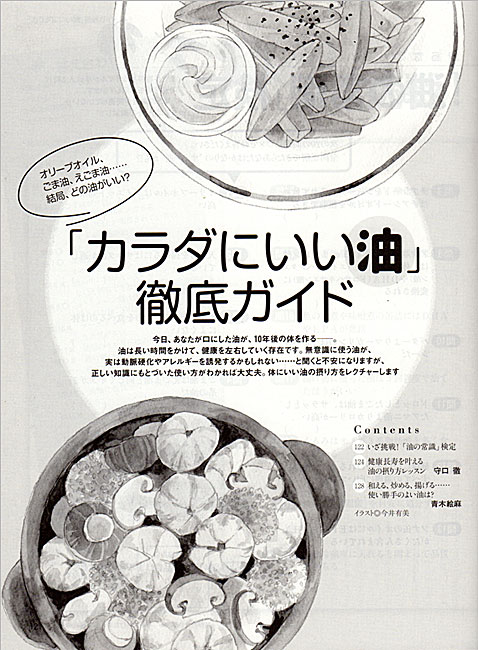 【内容】 婦人公論「カラダにいい油 徹底ガイド」イラスト <2018.6> 【画材】 画用紙、墨汁、鉛筆