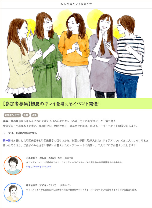 「みんなのキレイの計り方」内にある時間美容・時間栄養学セミナーの開催告知用のページでイラストを描きました。